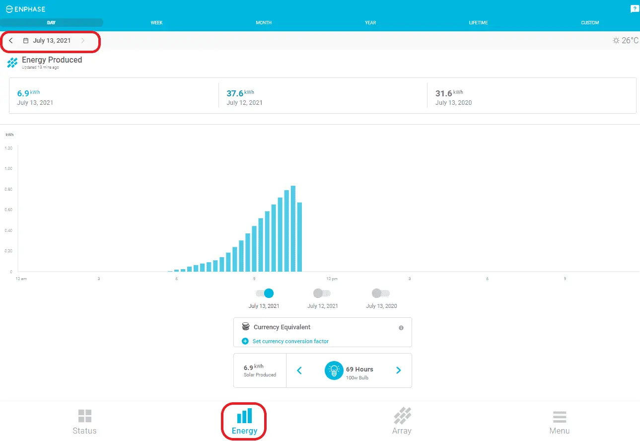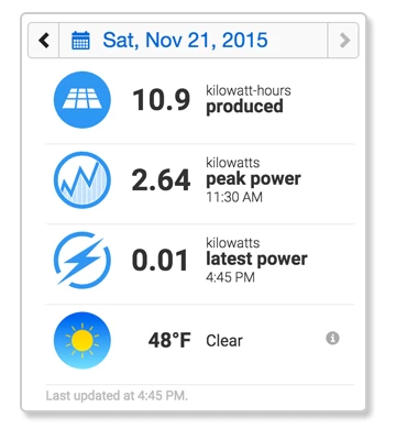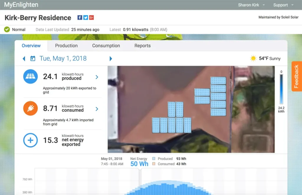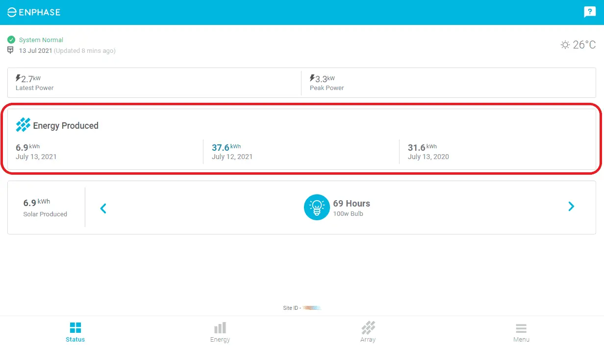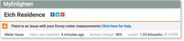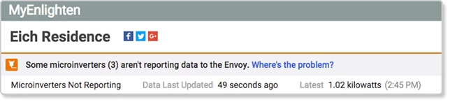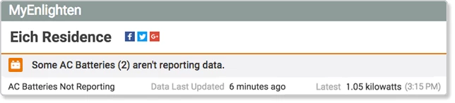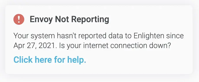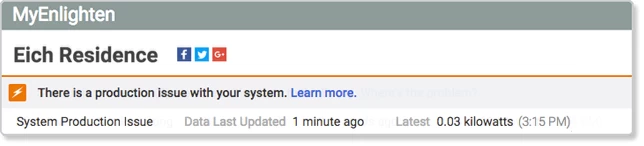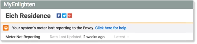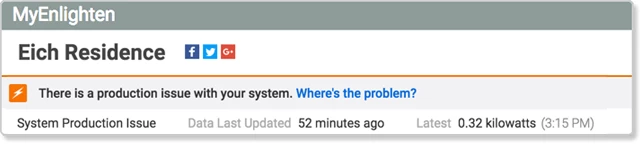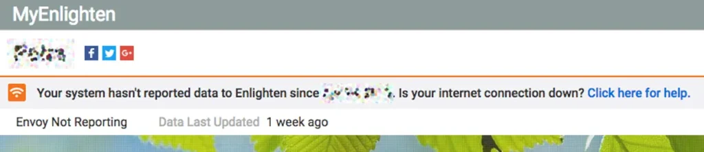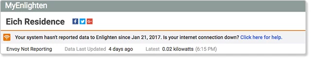 If Enlighten is not updating with current production data, it may be because your system is no longer connected to the Internet. You can verify this by checking the status indicator at the top of your MyEnlighten overview screen: