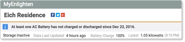 This may not indicate a problem, especially if there hasn’t been enough sunshine to produce energy that exceeds your home’s consumption, or if your home’s energy use has gone down to the point that the batteries don’t need to discharge. If the message persists and is not due to unusual production or consumption conditions, contact us for help.